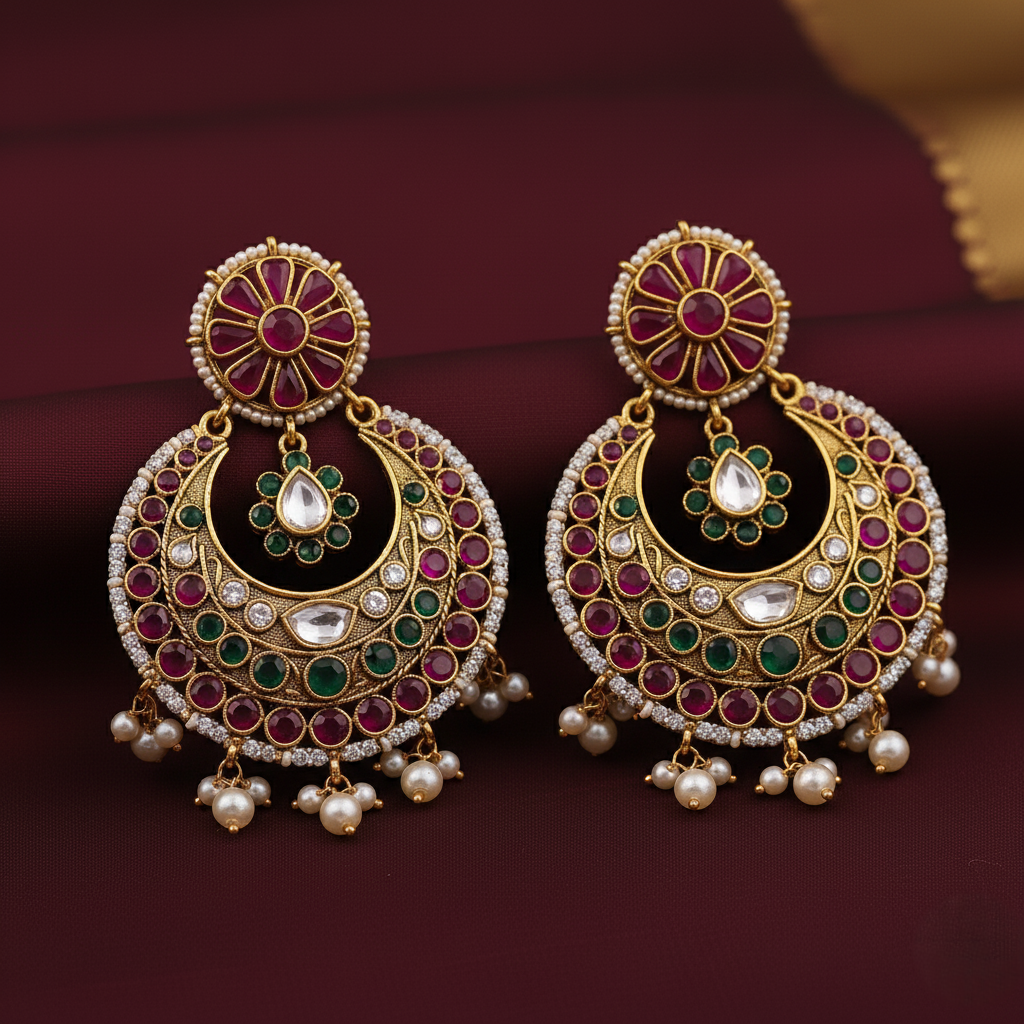 Chandbali design earrings with ruby & emerald stones, perfect for parties and festivals.