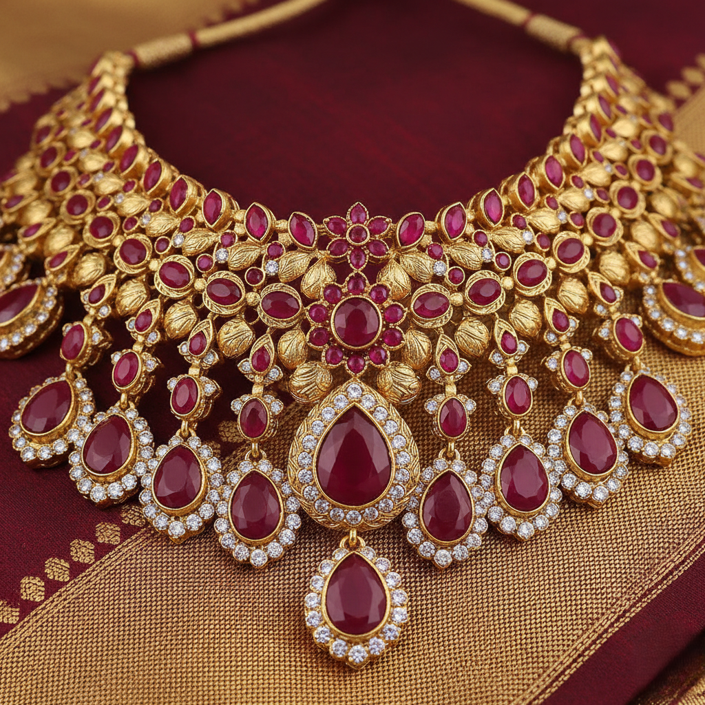 Description: Elegant bridal necklace with ruby red stone detailing, perfect for weddings and festive occasions. Long-lasting polish with a rich gold finish.