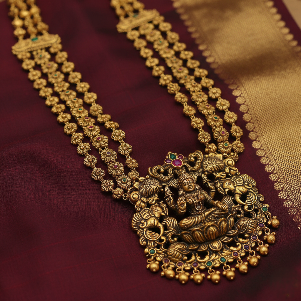 Long haram with Goddess Lakshmi design, antique finish, and temple-style craftsmanship. Best for traditional wear.
