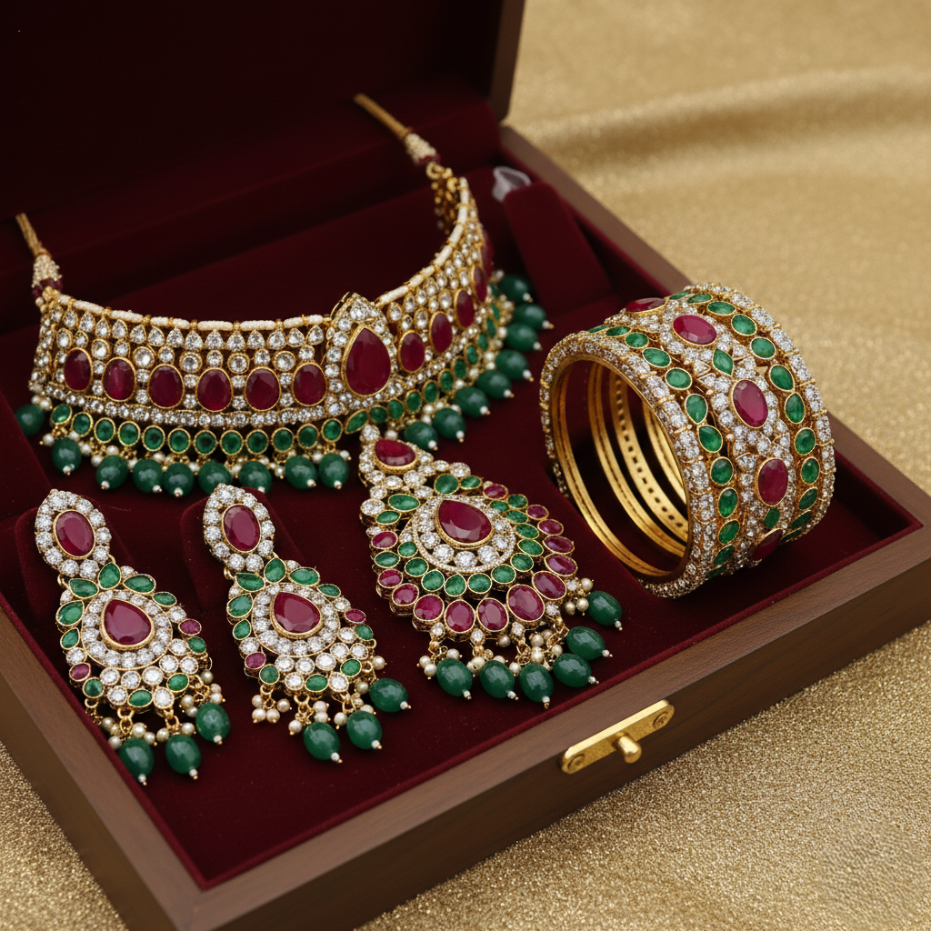 Premium wedding set featuring ruby and emerald stones, designed for a royal bridal look.